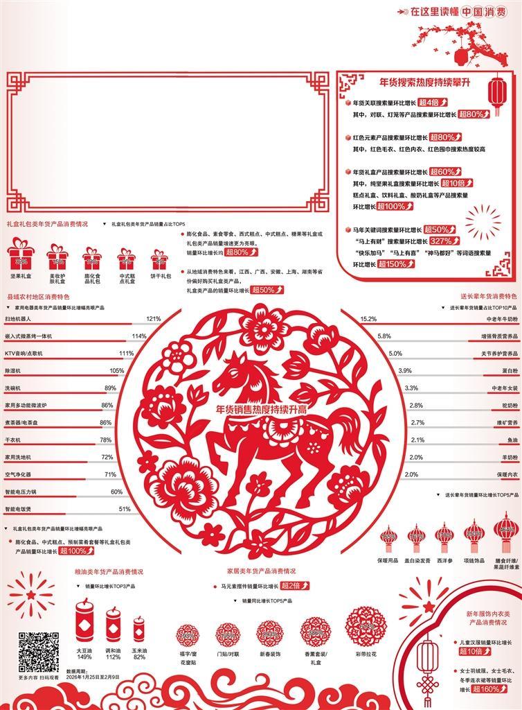 當(dāng)前,年貨消費(fèi)呈現(xiàn)出“新舊融合、多元拓展”的顯著特征。一方面,承載吉祥寓意的“好彩頭年貨”持續(xù)走熱。其中,紅色元素全面滲透年貨消費(fèi)場(chǎng)景,在最受消費(fèi)者喜愛的紅元素年貨品類中,窗花、福字、燈籠、中國結(jié)等傳統(tǒng)裝飾產(chǎn)品持續(xù)熱銷,成為打造家庭年味氛圍的首選。同時(shí),“馬年”關(guān)鍵詞搜索量環(huán)比大幅增長,生肖酒、對(duì)聯(lián)、玩偶、抱枕等產(chǎn)品的搜索量環(huán)比增幅均超過80%。各類搭配馬年吉祥祝福的產(chǎn)品熱銷,在“龍馬精神”“馬上有?!薄耙获R當(dāng)先”等祝福語加持下,不少馬年禮盒類產(chǎn)品受到消費(fèi)者歡迎。