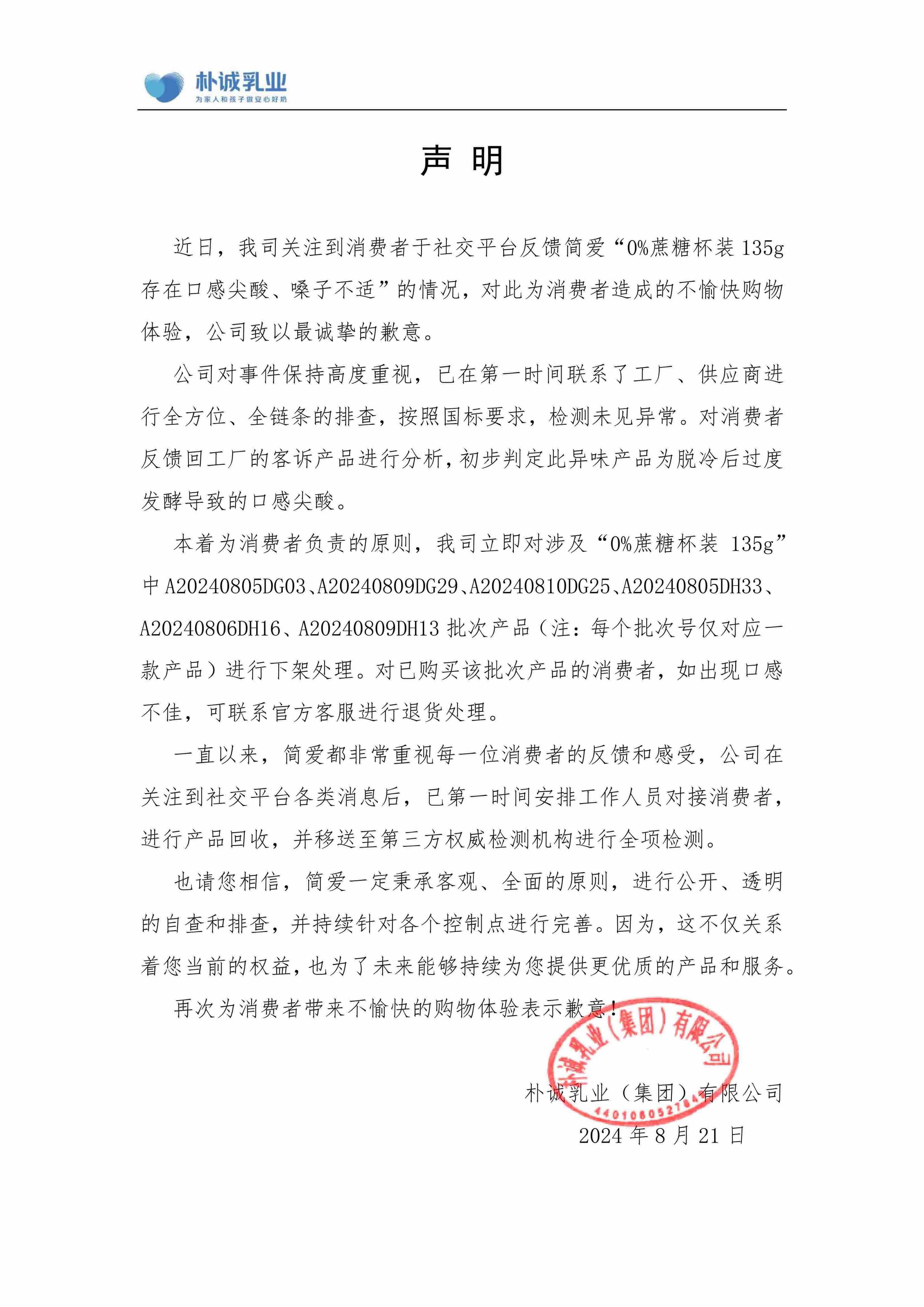 其在向記者發(fā)送的官方聲明中稱,公司已在第一時間聯(lián)系了工廠、供應(yīng)商進(jìn)行全方位、全鏈條的排查,按照國標(biāo)要求,檢測未見異常。對消費(fèi)者反饋回工廠的客訴產(chǎn)品進(jìn)行分析,初步判定此異味產(chǎn)品為脫冷后過度發(fā)酵導(dǎo)致的口感尖酸。本著為消費(fèi)者負(fù)責(zé)的原則,該司立即對涉及“0%蔗糖杯裝135g”中A20240805DG03、A20240809DG29、A20240810DG25、A20240805DH33、A20240806DH16、A20240809DH13批次產(chǎn)品進(jìn)行下架處理。對已購買該批次產(chǎn)品的消費(fèi)者,如出現(xiàn)口感不佳,可聯(lián)系官方客服進(jìn)行退貨處理。