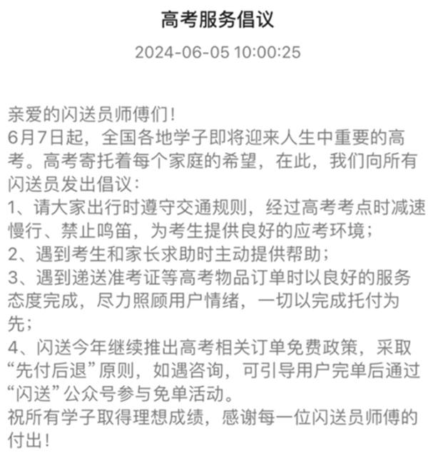 此外,閃送也向全國(guó)超過255萬閃送員發(fā)出倡議,號(hào)召騎手在高考期間文明騎行,主動(dòng)向考生和家長(zhǎng)提供幫助,用最好的精神面貌服務(wù)用戶,為高考加油。