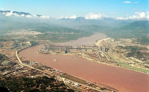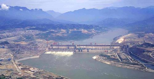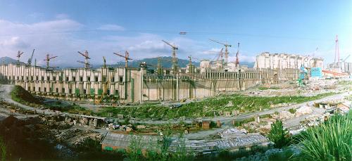 2001年8月拍攝的三峽工程電站廠房和泄洪壩段全景圖。新華社記者杜華舉攝