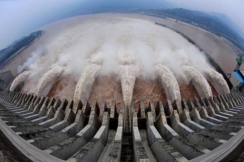 2008年8月13日,長江入汛以來的最大一次洪水順利通過三峽工程向中下游推進(jìn),中下游水位持續(xù)上漲,三峽工程運(yùn)行正常。2009年汛期,三峽水庫的防洪庫容已達(dá)146億立方米,開始發(fā)揮攔洪調(diào)峰和枯水期給下游補(bǔ)水的功能,下游荊江河段防洪標(biāo)準(zhǔn)已從十年一遇提高到了近百年一遇,長江中下游的防洪體系初步形成。新華社記者杜華舉攝