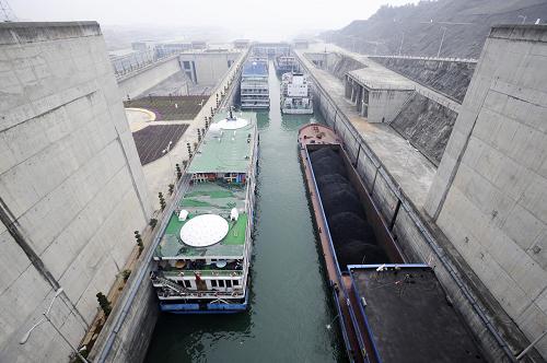 2008年2月23日,船舶在三峽船閘閘室內(nèi)等待過閘。2009年6月17日,三峽船閘安全穩(wěn)定通航6年,發(fā)揮了巨大的通航效益。截至6月底,三峽船閘累計(jì)運(yùn)行近5萬閘次,過閘貨運(yùn)量突破3億噸。新華社記者杜華舉攝