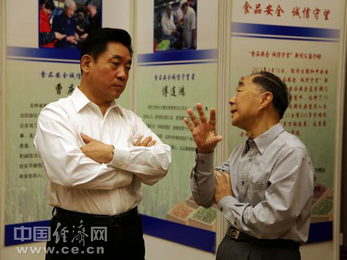 2013年全國食品安全宣傳周啟動(dòng)儀式暨第五屆中國食品安全論壇6月17日在北京舉辦,今年主題為“社會(huì)共治 同心攜手維護(hù)食品安全”。圖為食品藥品監(jiān)管總局副局長(zhǎng)劉佩智(左)和中國工程院院士陳君石參觀食品安全“誠信守望者”展覽。中國經(jīng)濟(jì)網(wǎng) 王耀峰/攝
