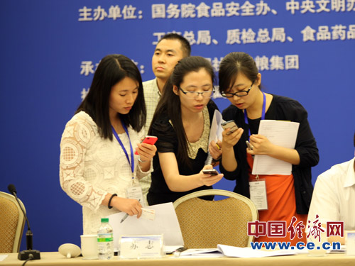 2013年全國(guó)食品安全宣傳周啟動(dòng)儀式暨第五屆中國(guó)食品安全論壇6月17日在北京舉辦,今年主題為“社會(huì)共治 同心攜手維護(hù)食品安全”。圖為參會(huì)記者進(jìn)行交流。中國(guó)經(jīng)濟(jì)網(wǎng) 王耀峰/攝