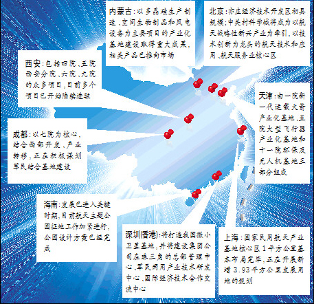 上海國家民用航天產(chǎn)業(yè)基地核心區(qū)1平方公里基本布局完畢,并正在開展新增3.93平方公里發(fā)展用地的概念性規(guī)劃和控制性詳細規(guī)劃。西安國家民用航天產(chǎn)業(yè)基地包括四院、五院西安分院、六院、九院的眾多項目,目前多個項目已開始陸續(xù)進駐。在四川成都,以七院為核心,結(jié)合西部開發(fā)、產(chǎn)業(yè)轉(zhuǎn)移,正在積極謀劃軍民結(jié)合基地建設(shè)。在中國北疆的內(nèi)蒙古,集團公司以多晶硅生產(chǎn)制造、空間生物制品和風(fēng)電設(shè)備為主要項目的產(chǎn)業(yè)化基地建設(shè)取得重大成果,相關(guān)產(chǎn)品已推向市場,取得了較好的經(jīng)濟效益。