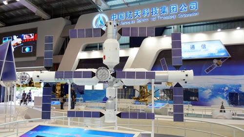 在此次航展中,中國航天科技集團(tuán)公司推出代表月球探測工程最新成果的“嫦娥二號(hào)”衛(wèi)星模型,代表“北斗導(dǎo)航”工程、直徑達(dá)7米、蔚為壯觀的天地一體衛(wèi)星運(yùn)行沙盤,1:1的“天宮一號(hào)”目標(biāo)飛行器模型、新一代運(yùn)載火箭以及代表深空探測計(jì)劃的“螢火一號(hào)”衛(wèi)星模型等國家重大工程項(xiàng)目近100項(xiàng)新展品首次亮相。圖為長期有人照料的空間站模型。(宗文)